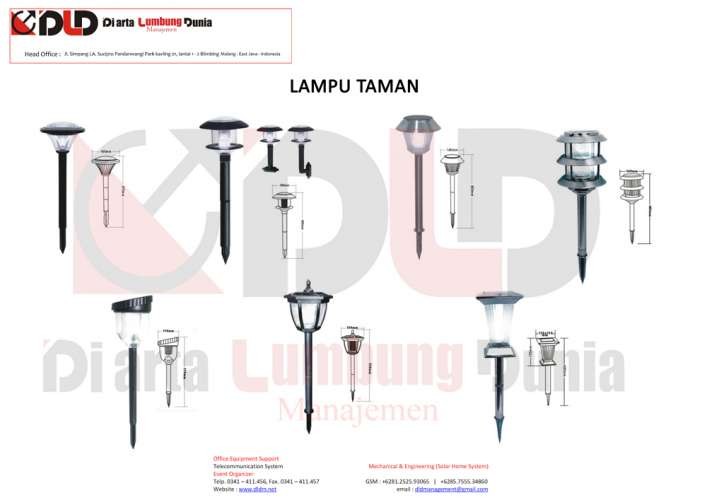 KamiPT. Diarta lumbung Dunia management kini menyediakan Lampu taman yang dapat menerapkan sistem pembangkit listrik tenaga surya. Lampu taman ini dapat digunakan untuk lingkungan perumahan, maupun di sepanjang jalan raya atau jalan utama..